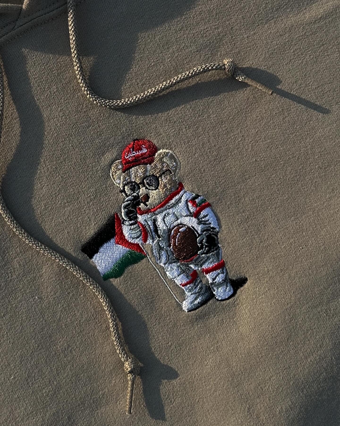 This hoodie features a 4-inch illustration of an astronaut teddy bear proudly representing Palestine, centered on the chest. Symbolizing both warmth and resistance, the design blends softness with strength—perfectly capturing the spirit of Palestinian pride.